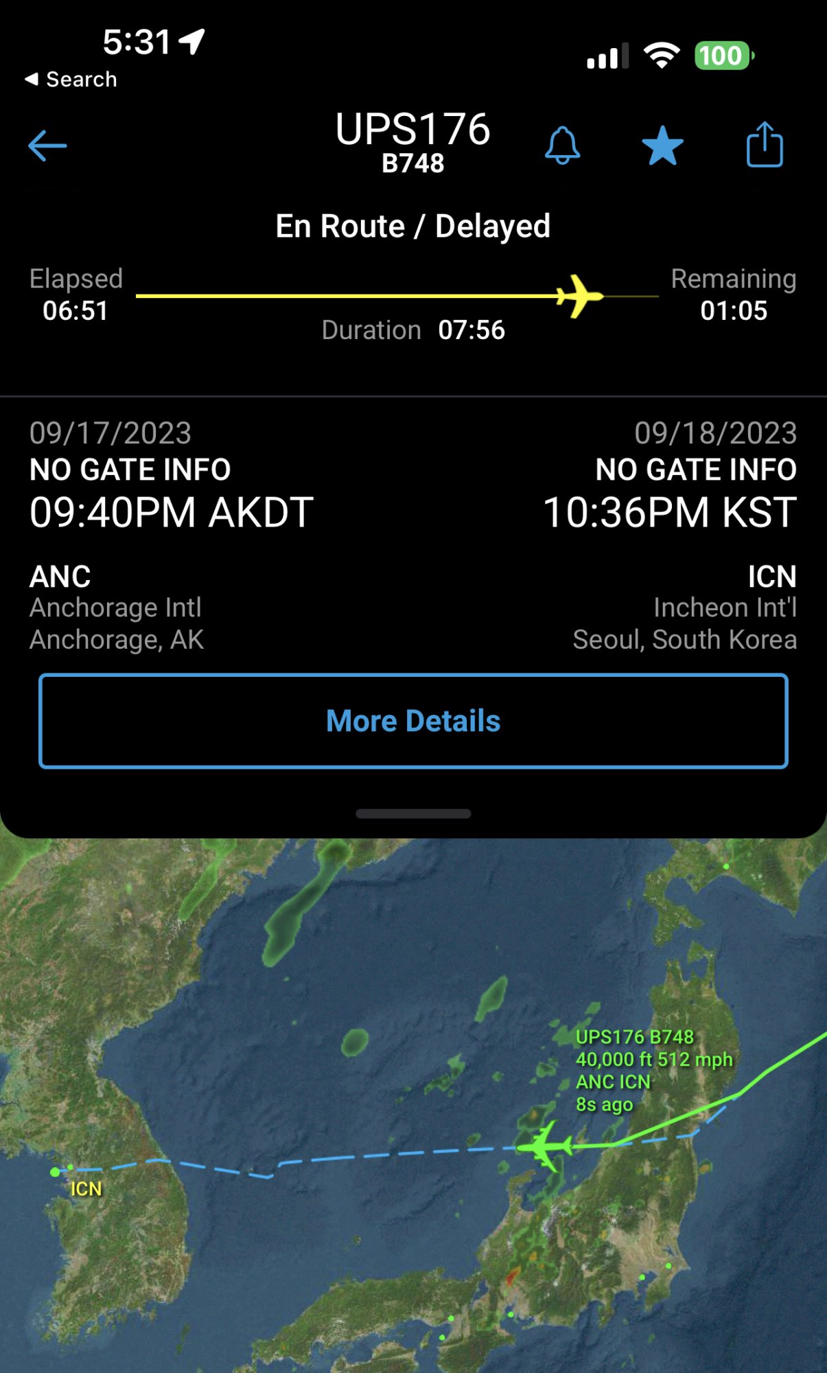 Wait, why is it going from Alaska to Korea?UPS 176 is expected to land shortly. Almost an hour left. Hopefully, this is the one as @FlightLevel310 suggested! Stay tuned! We are keeping a close eye on it.