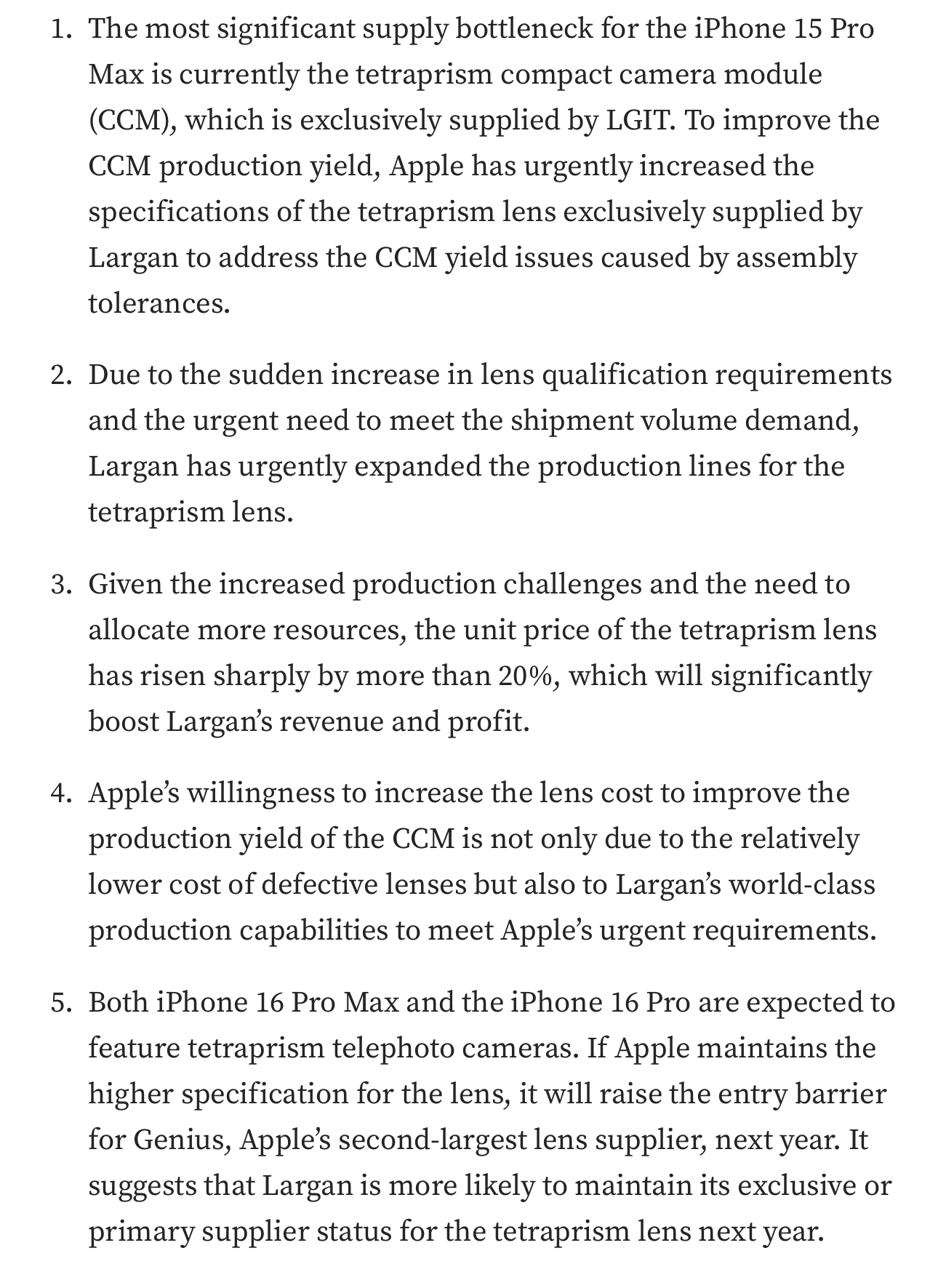 iPhone 15 Pro Max delivery time depends entirely on the shipments of tetraprism (periscope) lenses exclusively supplied by Largan; the unit price of tetraprism lens increases significantly by more than 20%.