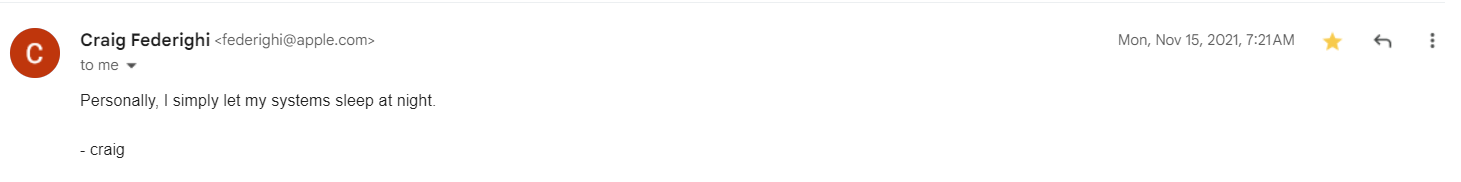 I got to talk to him for a few minutes back in 2017 at WWDC. That counts for something i guess.Fun Facts. Craig responded to my email. Craig knows who I am. Dated: November 15, 2021.