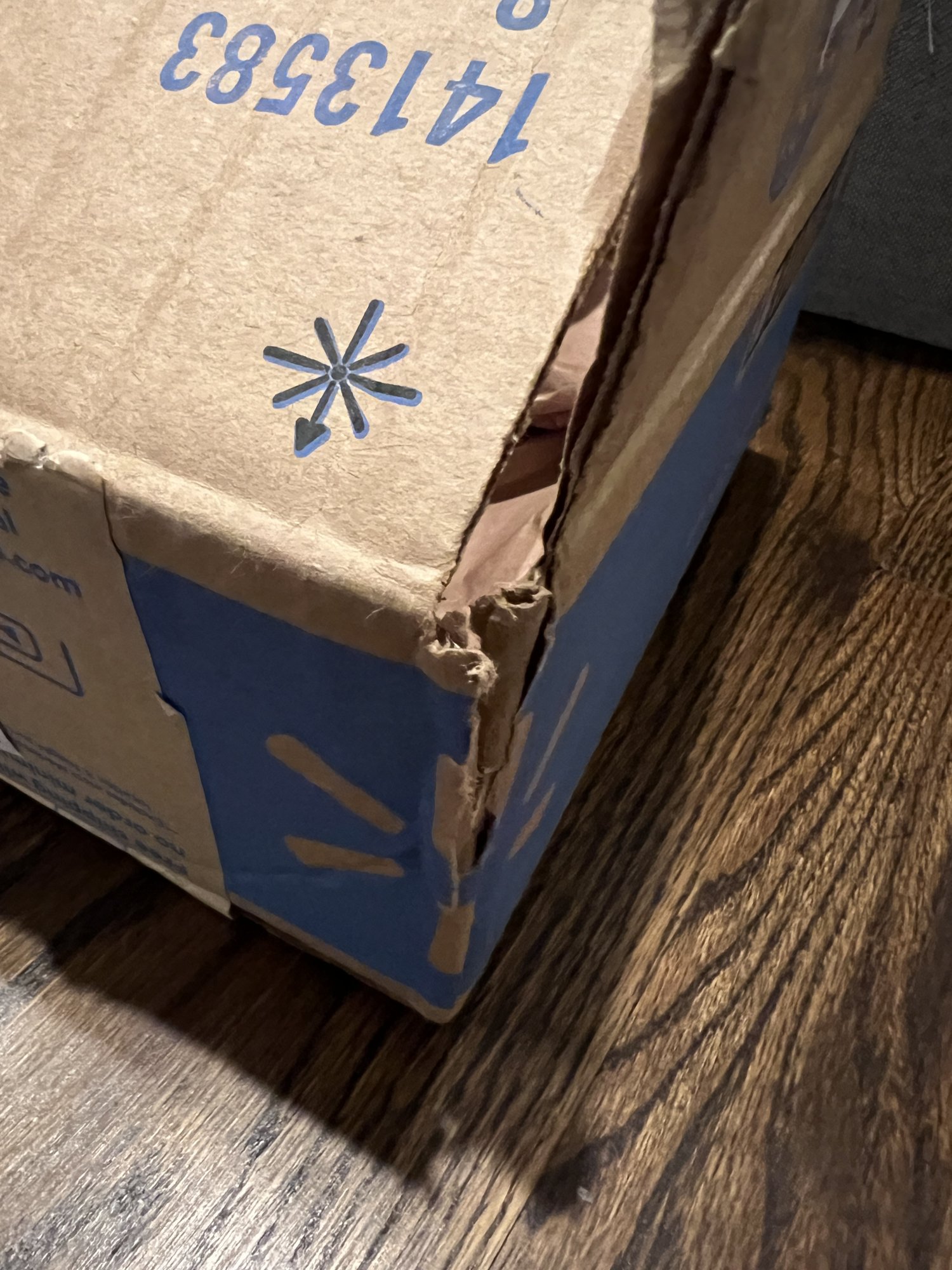 Here's some pictures of the package's condition, the Walmart box looks like it was cut into from the side.