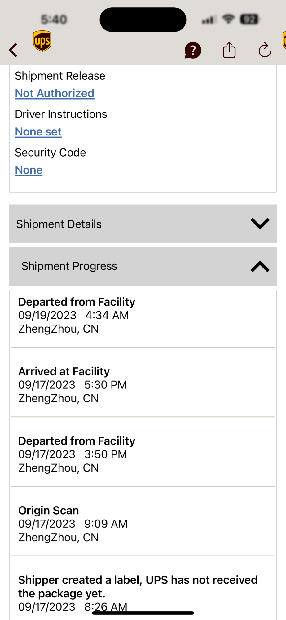 | 9/17/2023 05:30 PM | Arrived at Facility ZhengZhou, China Mainland |