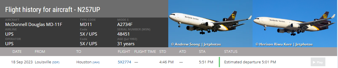 I also found the flight from Louisville to Houston scheduled today. Aircraft is an MD11 N257UP which is 31 years old so its an old bird for sure. Scheduled to arrive 5:51PM CST.View attachment 2267658