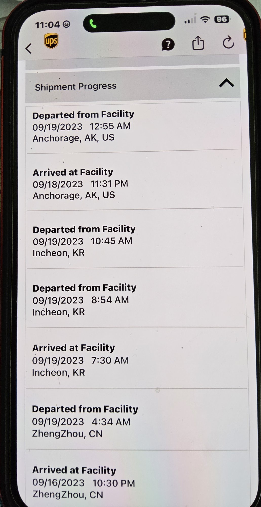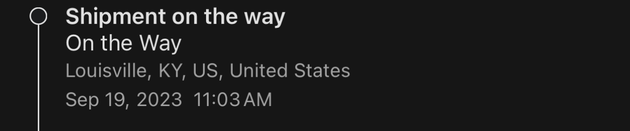 | 09/19/2023 11:03 A.M. | On the Way Arrived at Facility Louisville, KY, United States |