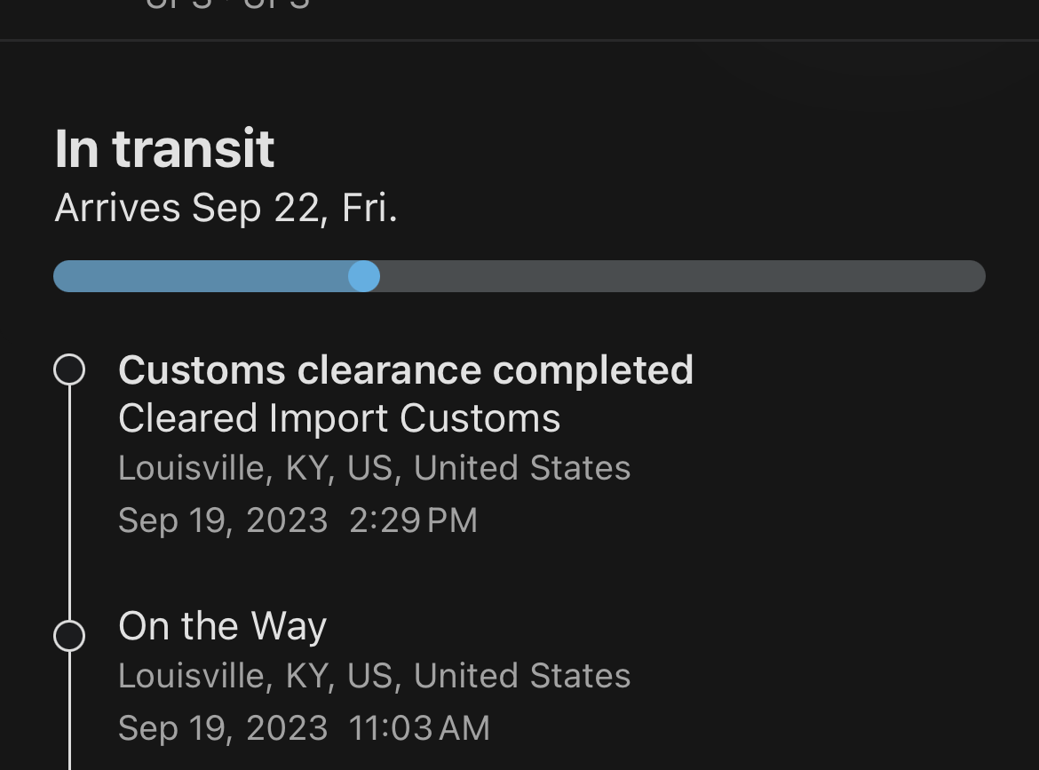 Same for me on Aftership and UPS. Been in Louisville KY since 11:03 am yesterday.yeah I just checked on aftership and still shows arrival in KY but no customs scan.