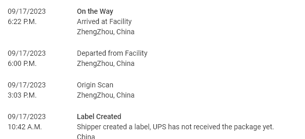 Order confirmation email at :09. Still stuck in China, last scan was on 9/17 at 6:22pm. But still says I'm on for a 9/22 delivery in Chicago.If you are still stuck in China. Please report!!!