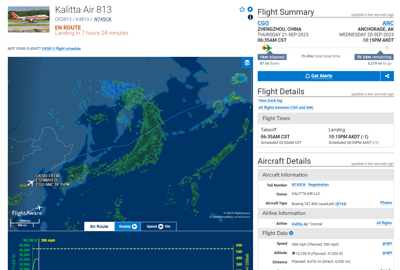 K4813 (CKS813) Kalitta Air Flight Tracking and History 21-Sep-2023 (CGO / ZHCC-PANC) - FlightAware