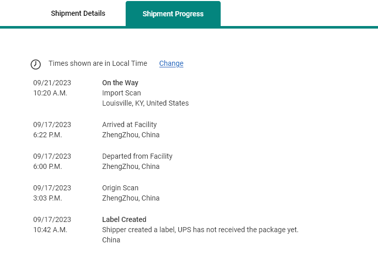 | 9/21/2023 08:03 AM | On the Way Import Scan Louisville, KY, United States |