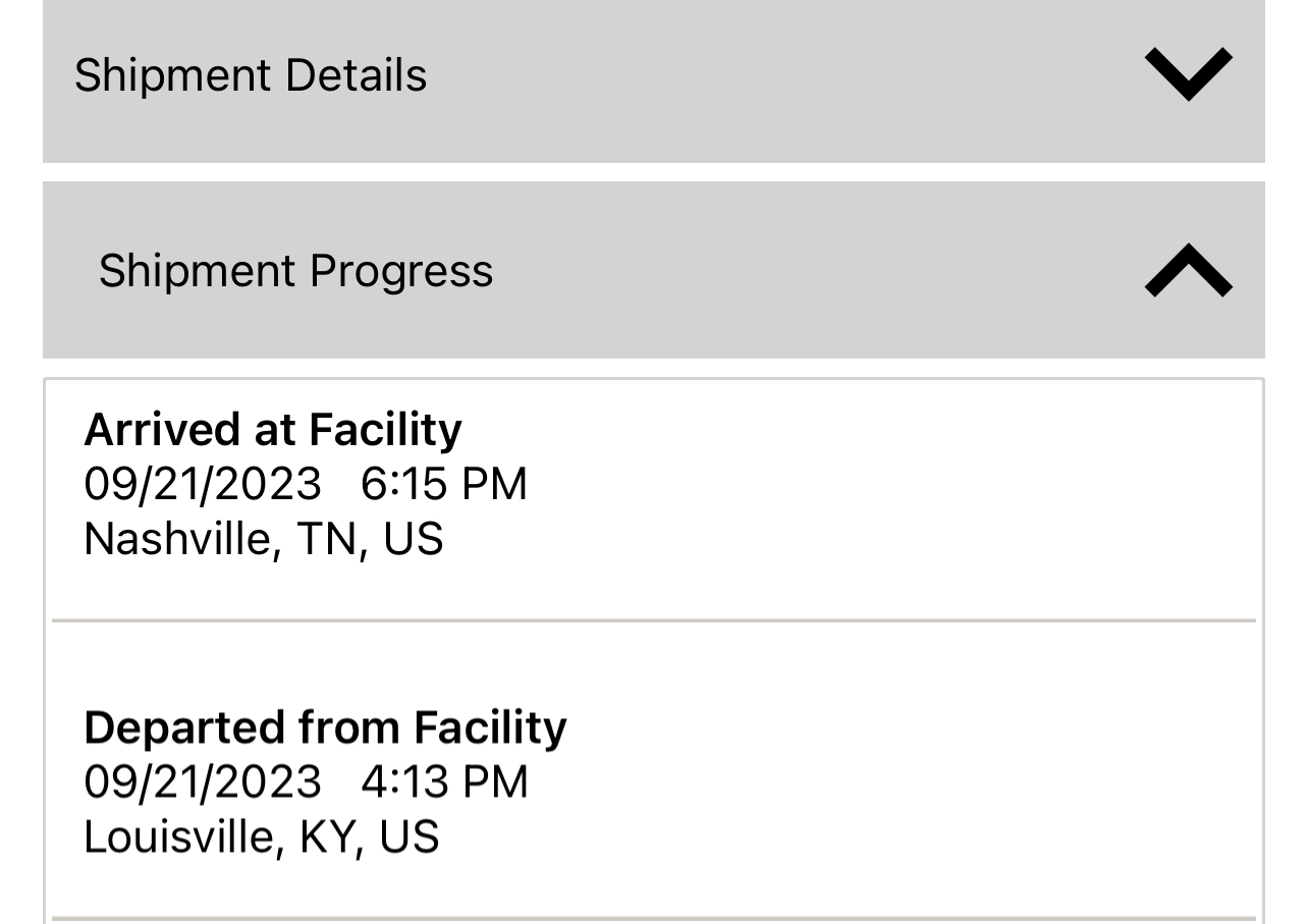 My phone, 512 Blue 15 Pro Max Wave 1 left Louisville at 1:40 Eastern Time this afternoon.