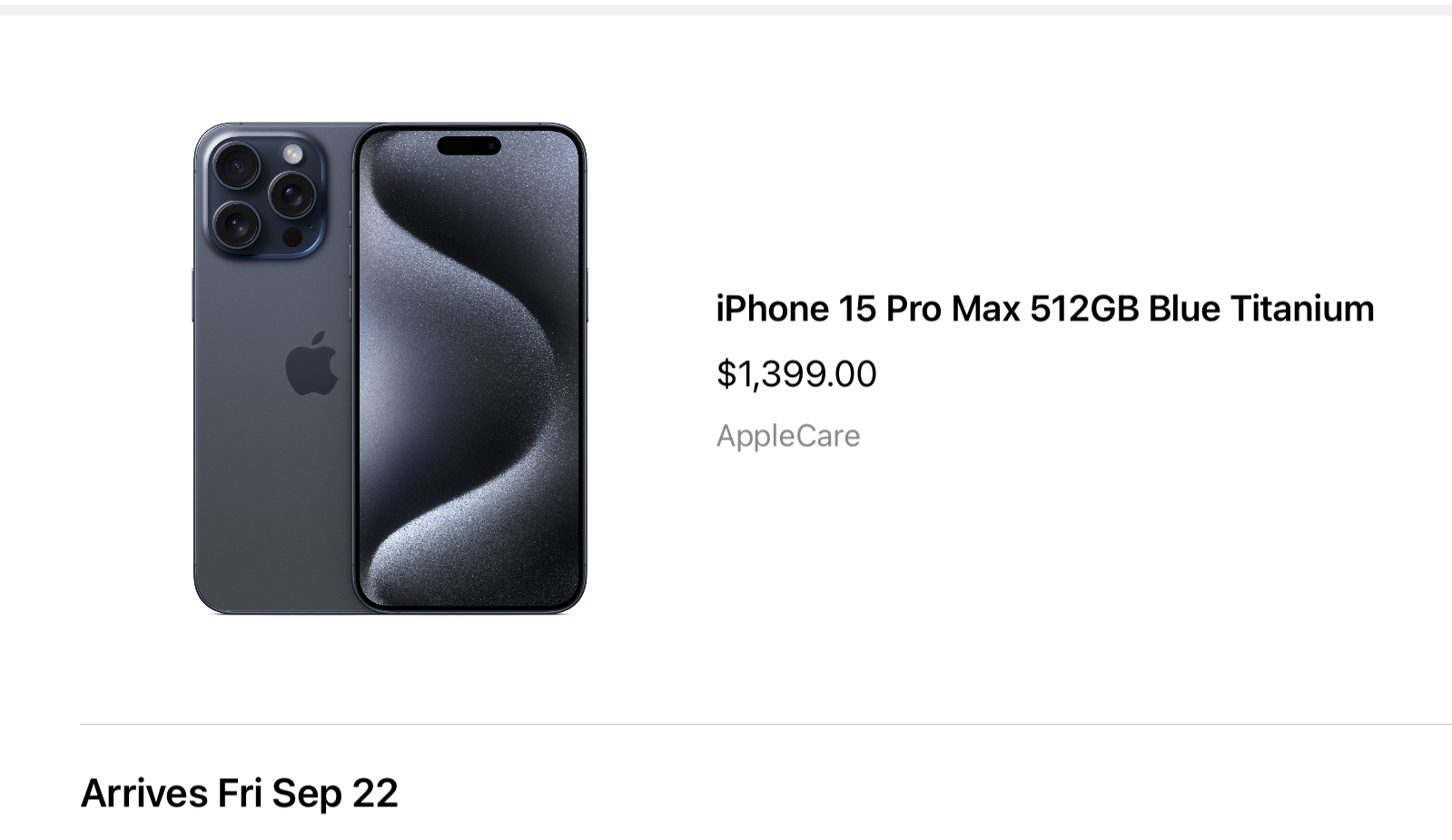Placed order (iPhone 15 ProMax 256GB Blue Titanium) at 802am EDT, received confirmation email at 802am, and September 22nd delivery!