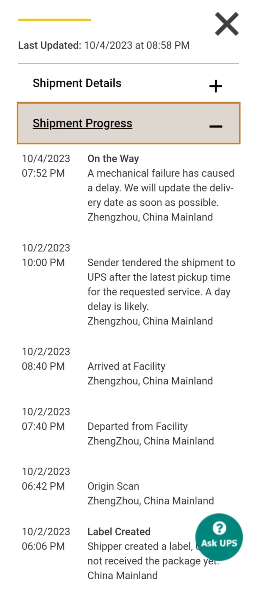 Exact same hereHey! Having issues since my iPhone was picked up by UPS on Monday. It wasn't tendered to UPS on time (it couldn't catch the flight on time I think), today the mechanical failure... 🥲