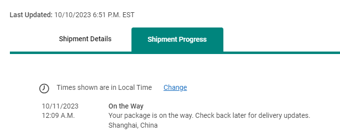 Not me. Just “Your package is in transit. We’re updating plans to schedule your delivery.” My scheduled delivery date is Oct. 10 by 7 PM, but I am pretty sure that didn’t happen.Did anyone have moved from shanghai?