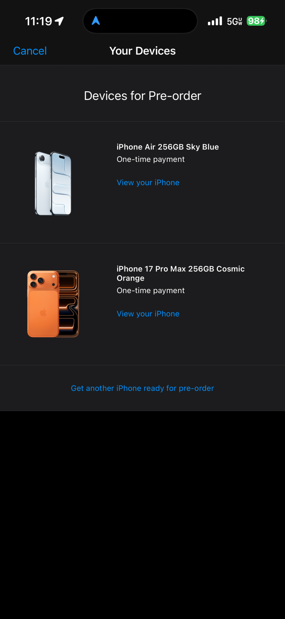 If I'm able to on Friday morning, I'm going to order for pu at the store on Saturday. I'm also getting a Watch Series 11 and the new AirPods. (Here, Apple, take all my money!) The Watch is coming UPS on Friday — I had no option for store pu — and I'm afraid to miss the watch delivery if I try to pick up the phone on the same day. I scheduled the AirPods for Saturday pick up, so I might as well get the phone at the same time.