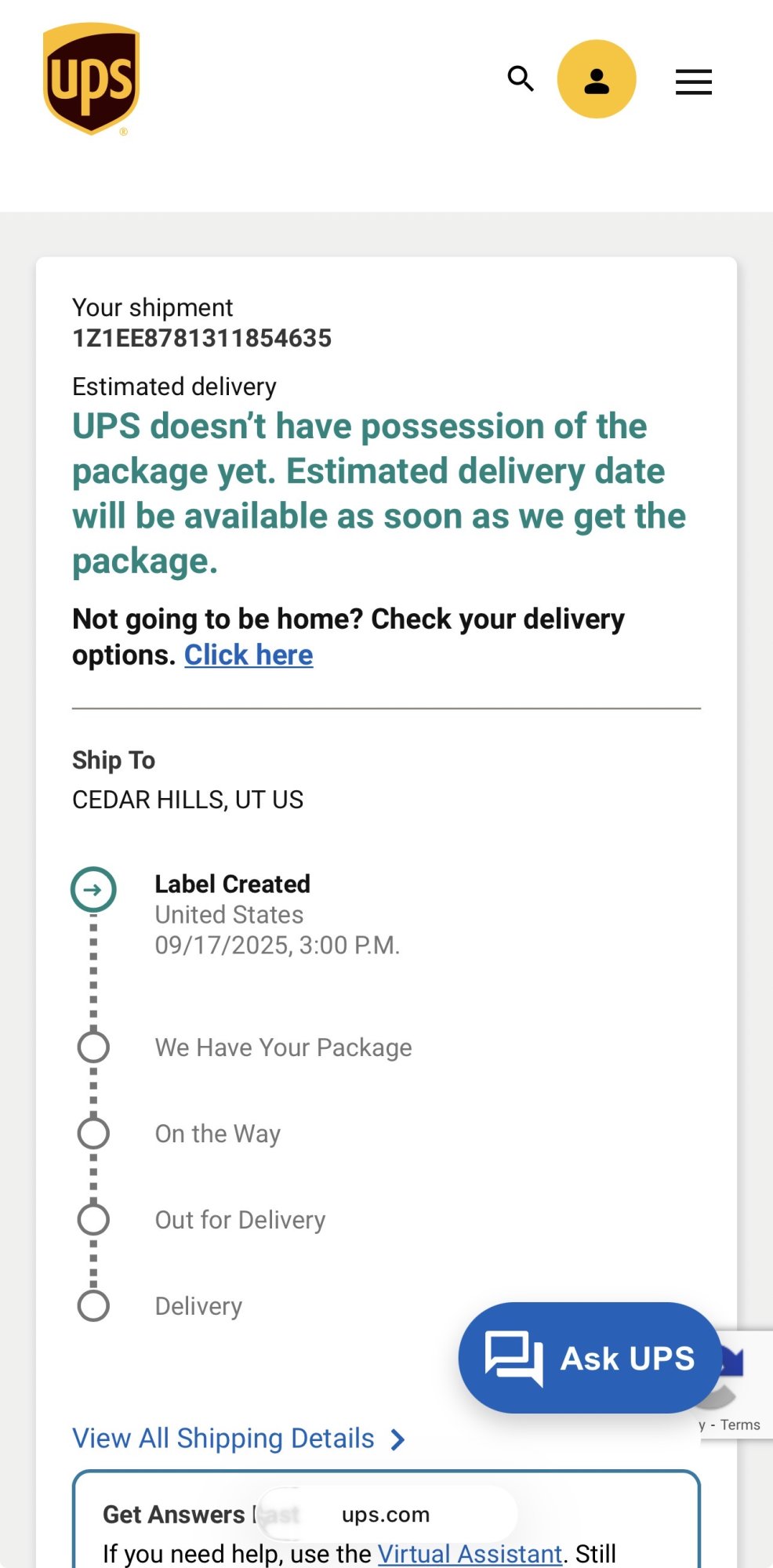 yup same boat now. Was originally a 9/22 delivery, flipped to 9/19 today and got tracking now waiting for first scanAnyone getting this? Delivery is set tomorrow and says it is shipped but UPS doesn’t have it yet ??? iPhone 17 PM 512 deep blue