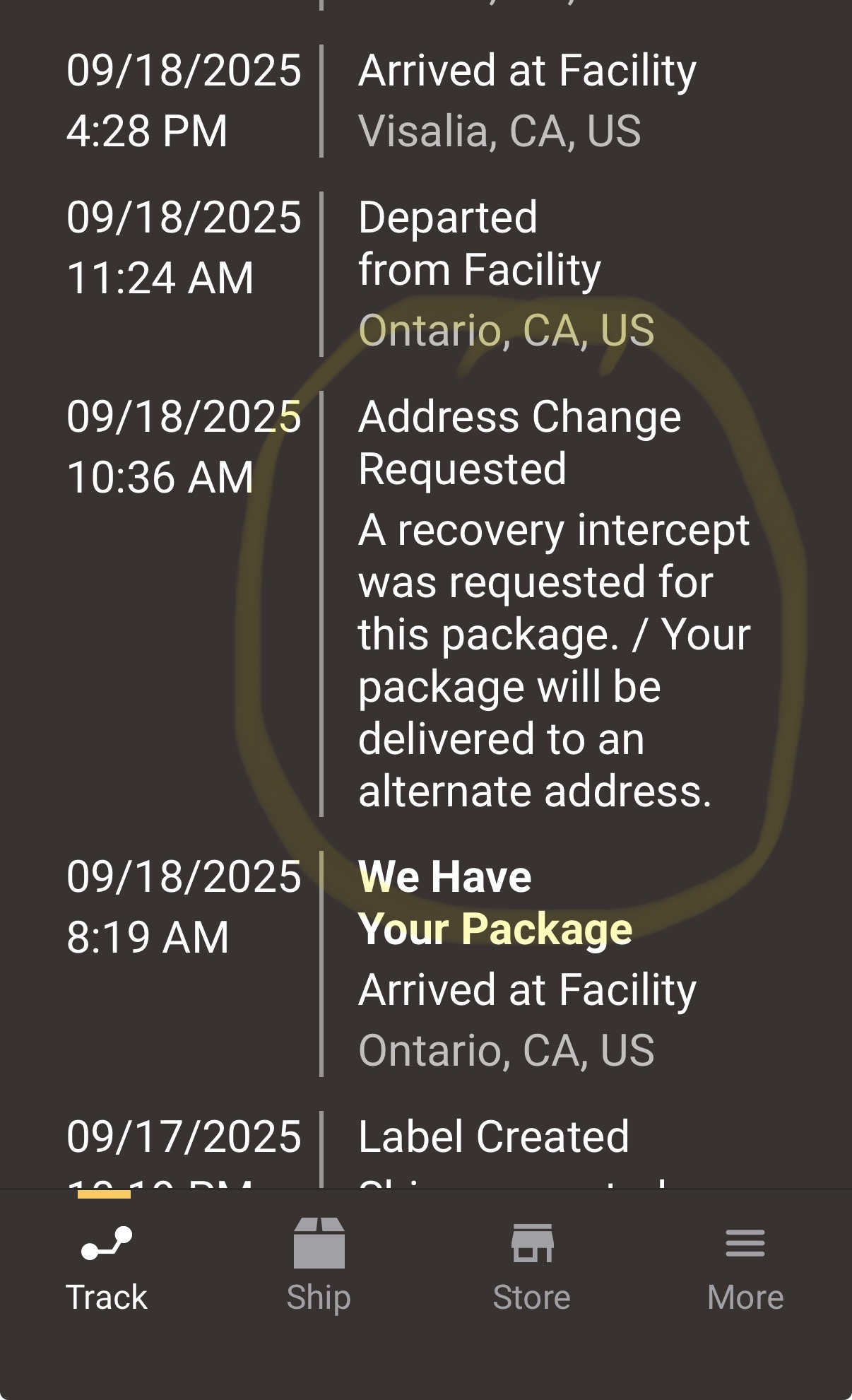 I just realized this on my tracking. Has anyone else had this show up on their tracking? I didn’t make a change. Right now it’s sitting in Lathrop which is not too far from me.
