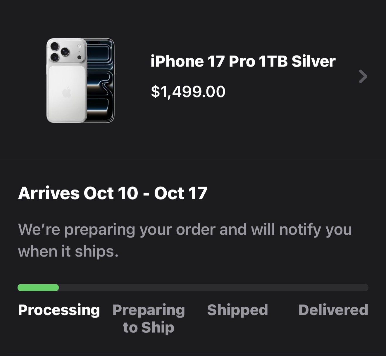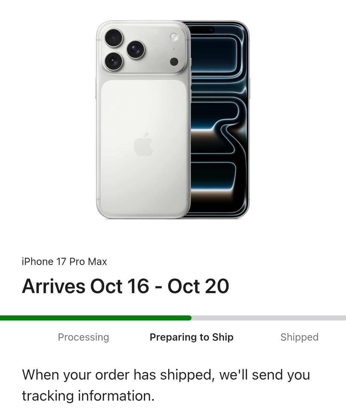 My two iPhone 17 pro max silver 512gb just change to Preparing to ship and got charged for them. Original estimated ship dates were October 13-20
