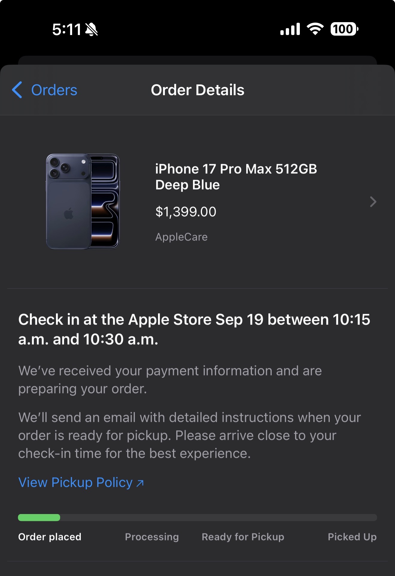 17 Pro Max, Silver 256, pickup 19th, delivery 25th. I’m having it delivered. The store is such a zoo.