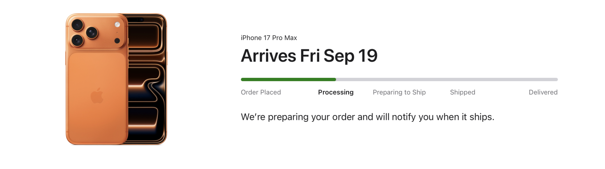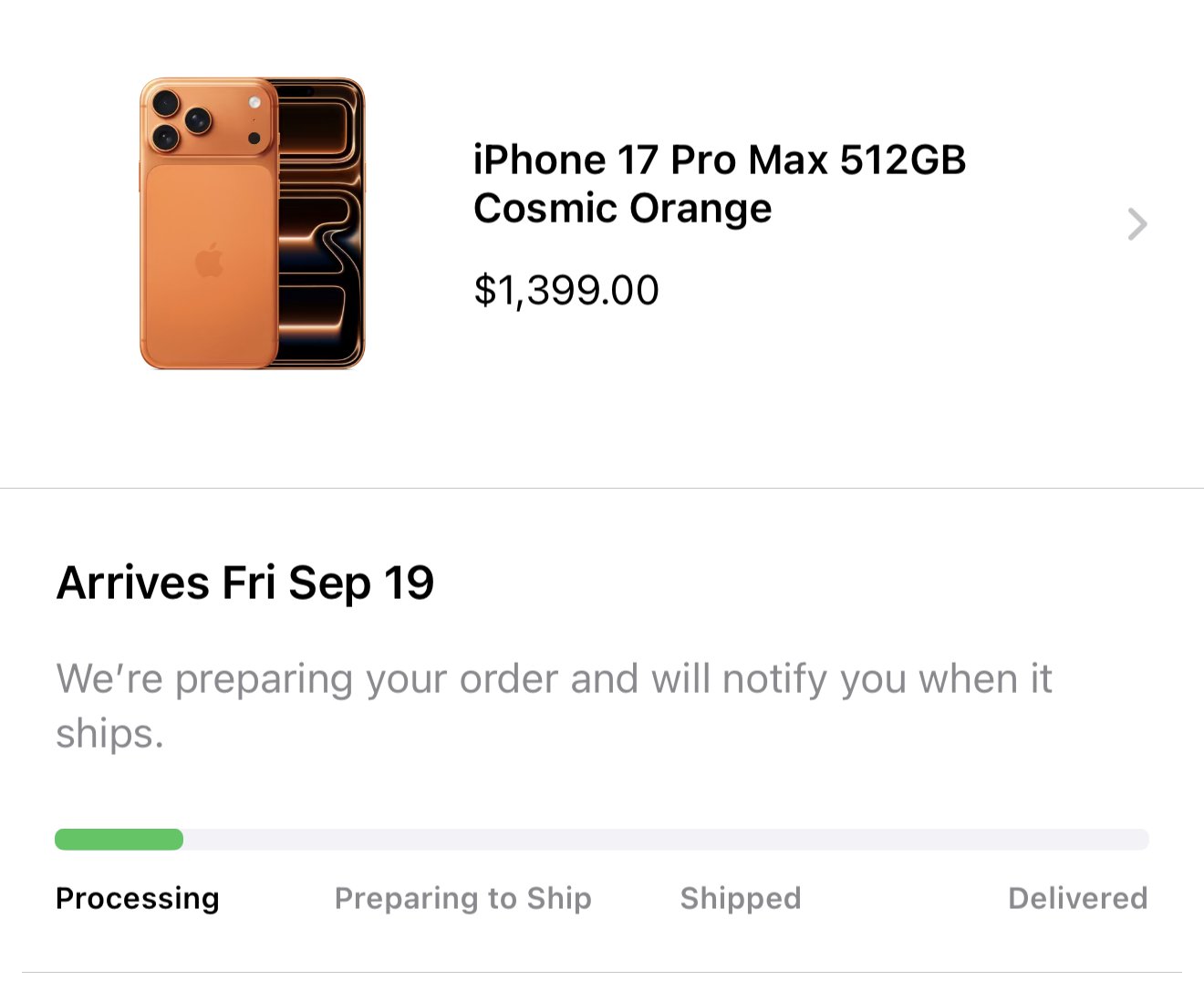 Opposite seems to happen for me. It says launch day delivery, only to be pushed up by a week later. It’s happened to me twice in the past with launch day delivery. 👎 Says launch day delivery, not holding my breath though. 🤷🏼♂️ 17 PM cosmic orange.