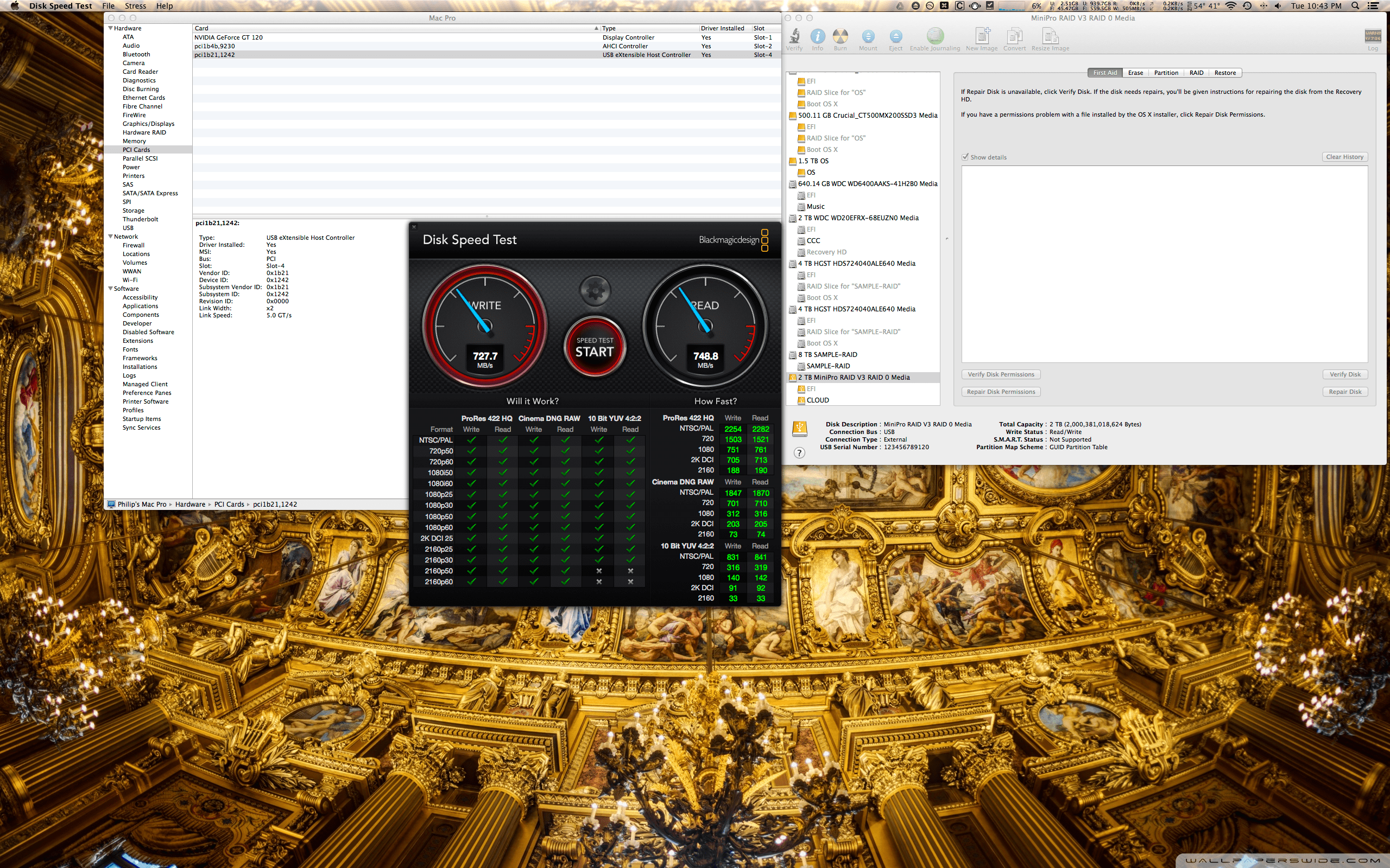 Although it says the speed is 5Gb/sec, wouldn't that max out at 625mb/s, which the raid exceeds? I'm assuming if I added more SSD's to the raid it would be faster than the ~750 I'm getting. Not sure though.Can you click on USB on the left pane and then show us the Device Tree on the right pane. Then choose the USB Bus belonging to the card so that we can see which Host Controller Driver it is using.