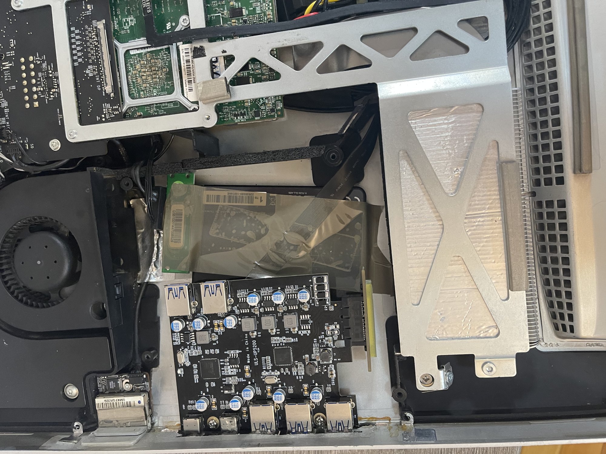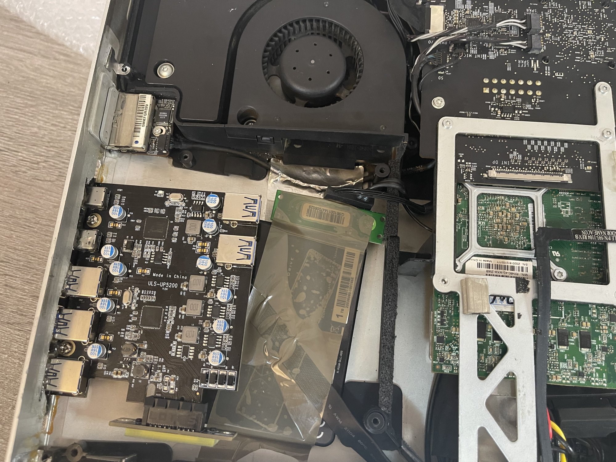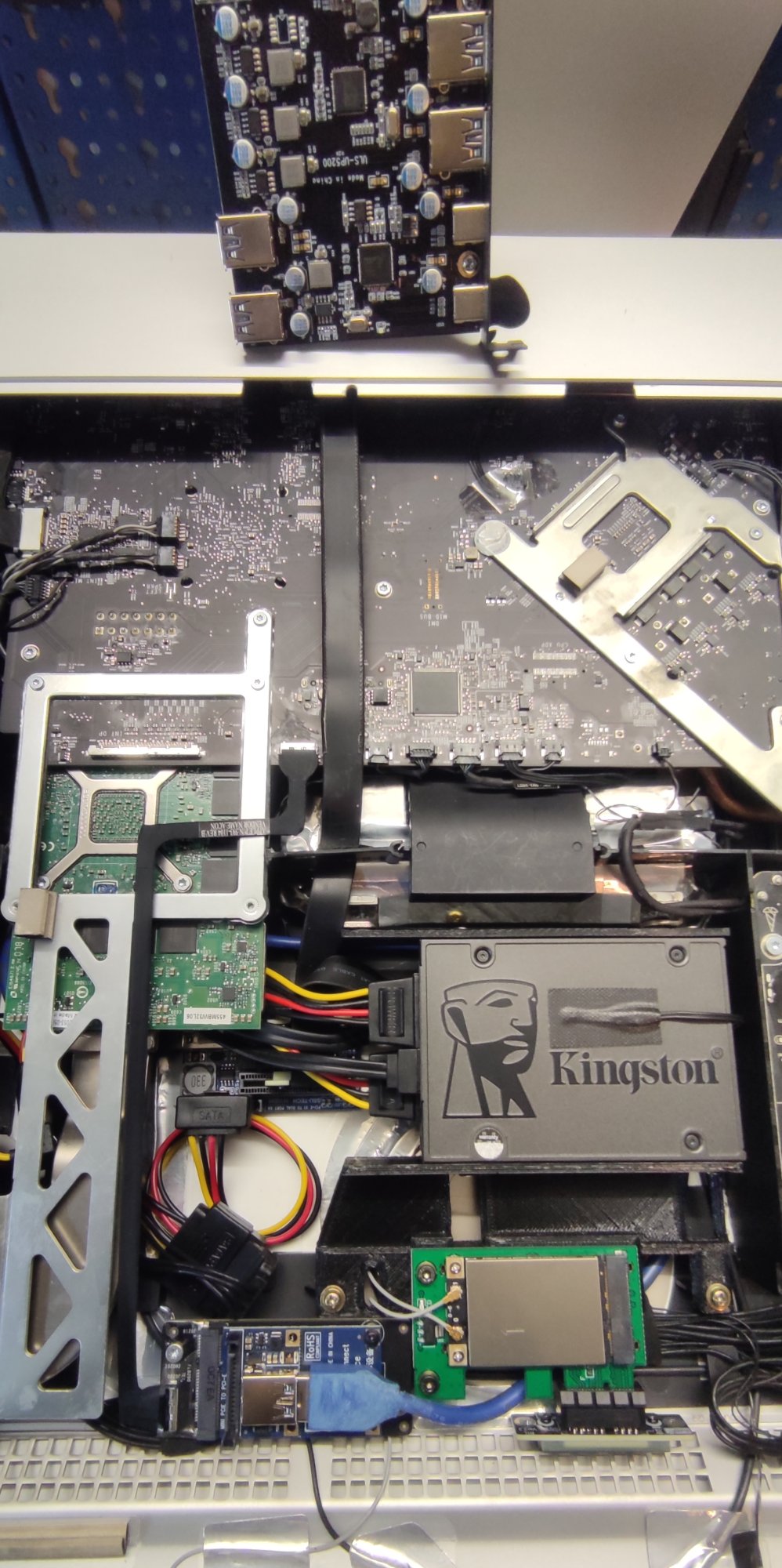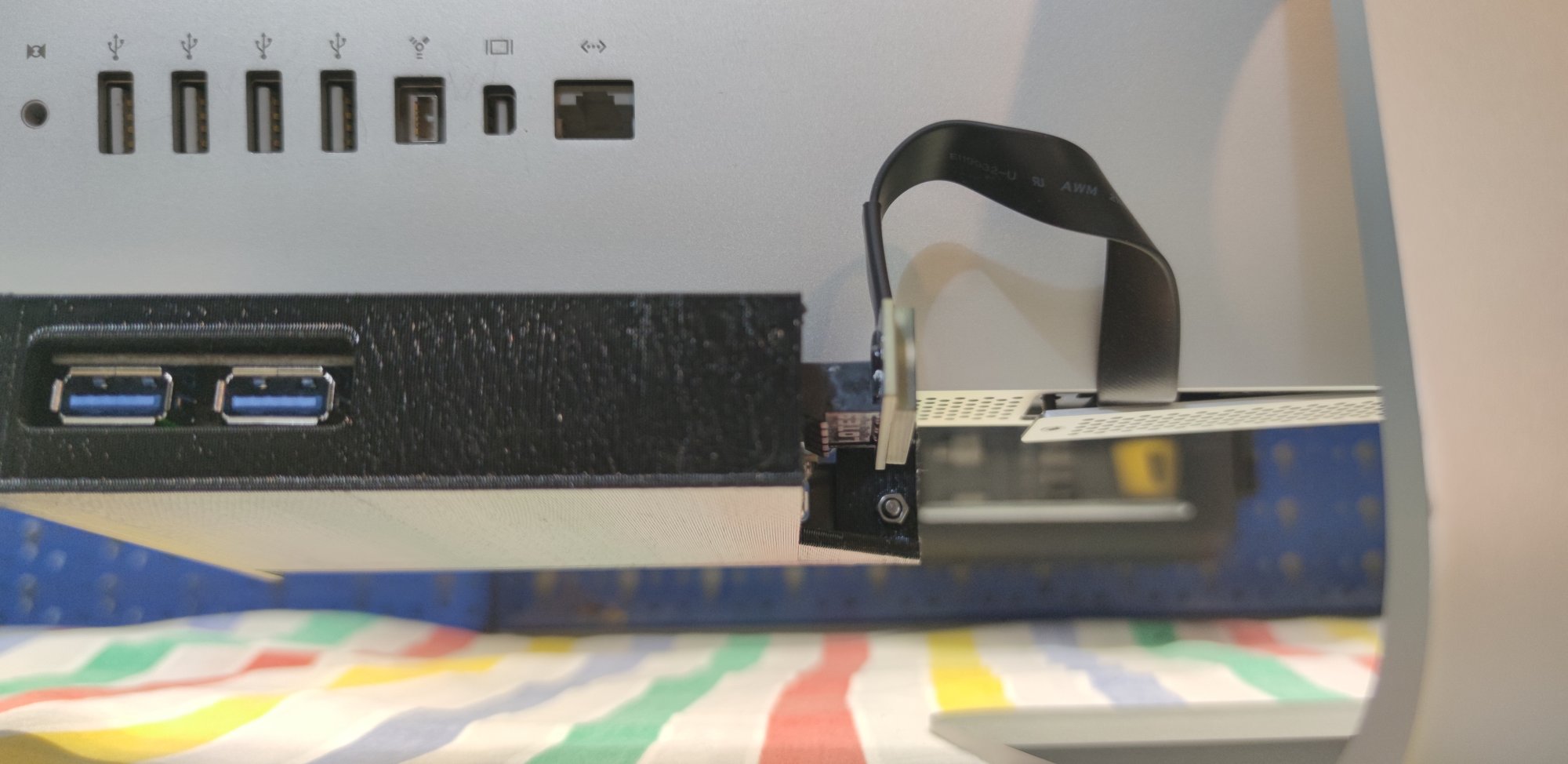 Hi, I wanted to thank the work done by @KennyW ... I needed USB3 ports on my 2 iMacs (2010-2011), I share my experience. IMAC 2011 I got "Kanex Thunderbolt - Estate / USB 3.0" adapter. Instead for IMAC 2010 we took some time to get the various components, their arrangement without making invasive holes on the IMAC body. I printed myself with 3D prints of the containers and brackets for the best arrangement of the various components with the use of the double -sided tape. As you can see in the photo I pass the flat cable (Flex) by housing the RAM. Everything works. I also attach the 4 .stl files for printing for those who have 3D printer. Thanks greetings