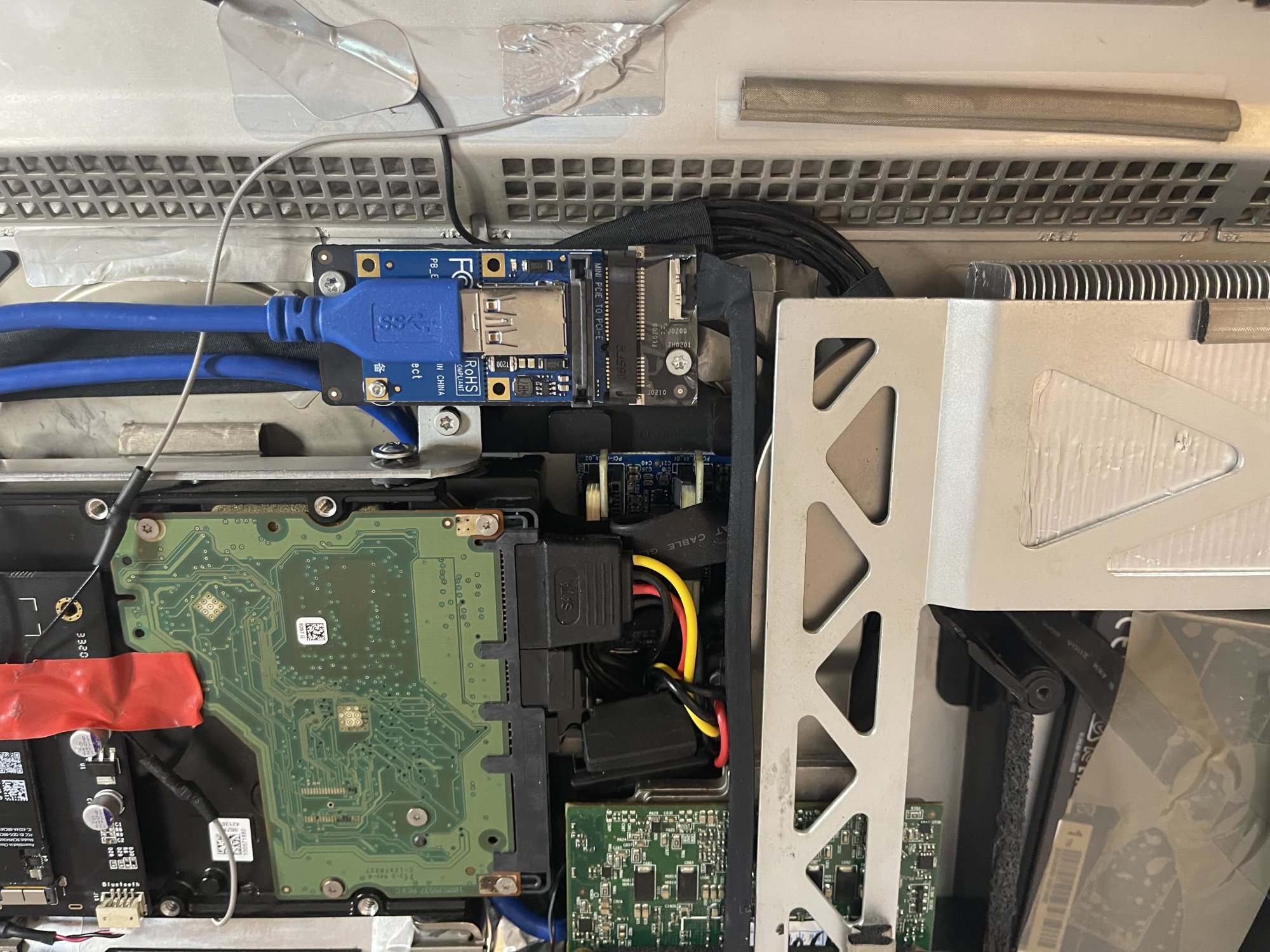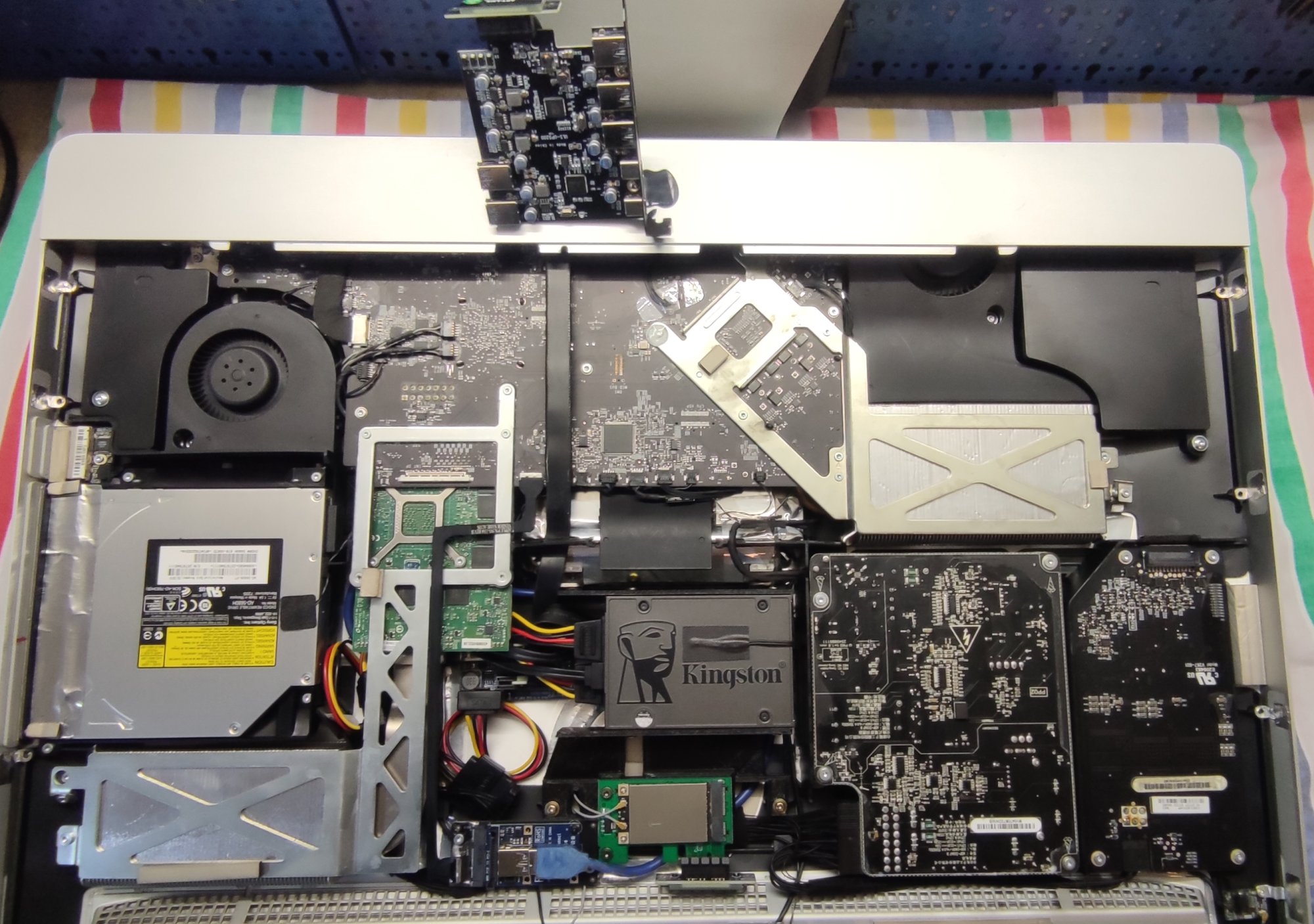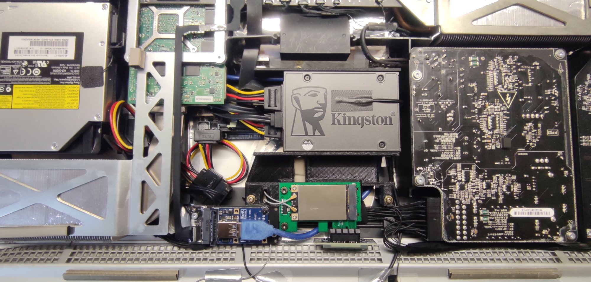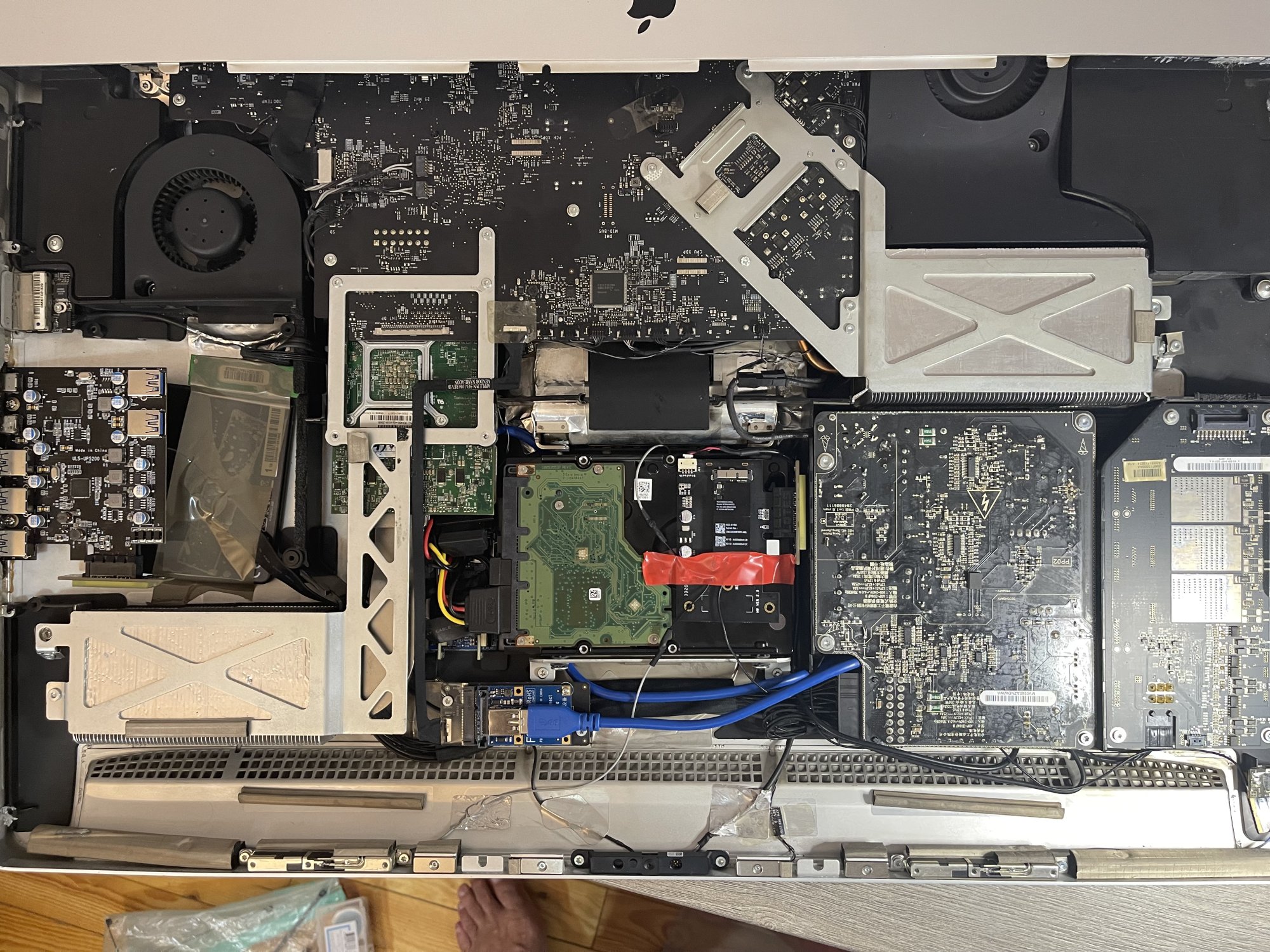 Hi, I wanted to thank the work done by @KennyW ... I needed USB3 ports on my 2 iMacs (2010-2011), I share my experience. IMAC 2011 I got "Kanex Thunderbolt - Estate / USB 3.0" adapter. Instead for IMAC 2010 we took some time to get the various components, their arrangement without making invasive holes on the IMAC body. I printed myself with 3D prints of the containers and brackets for the best arrangement of the various components with the use of the double -sided tape. As you can see in the photo I pass the flat cable (Flex) by housing the RAM. Everything works. I also attach the 4 .stl files for printing for those who have 3D printer. Thanks greetings