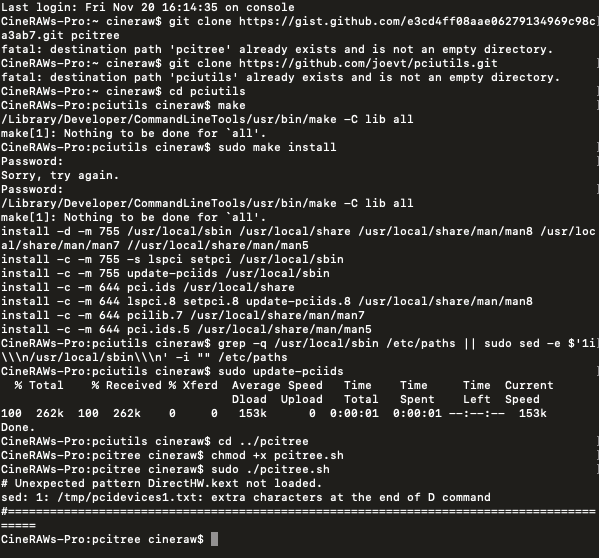 Code:git clone https://gist.github.com/e3cd4ff08aae06279134969c98ca3ab7.git pcitree git clone https://github.com/joevt/pciutils.git cd pciutils make sudo make install grep -q /usr/local/sbin /etc/paths || sudo sed -e $'1i\\\n/usr/local/sbin\\\n' -i "" /etc/paths sudo update-pciids cd ../pcitree chmod +x pcitree.sh sudo ./pcitree.sh