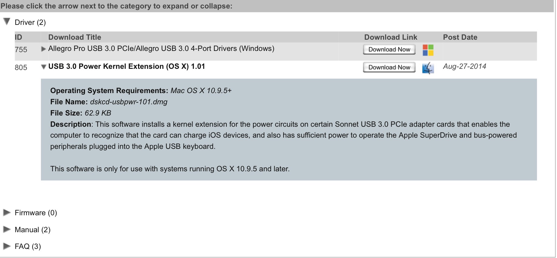 I my opinion, this is an exceptional card, that is slightly slower than the RocketU 1144C with similar specs. This card has additional features for charging devices such as iPhone, iPod, iPad etc… The Sonnet website recommends that you download a driver for charging support. I haven’t personally tested this, but the thread starter (ActionableMango) reports that this driver isn’t needed.