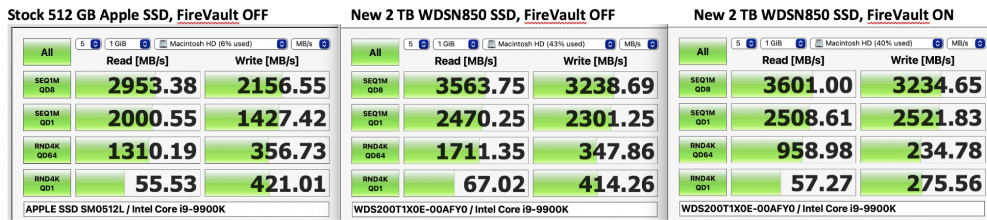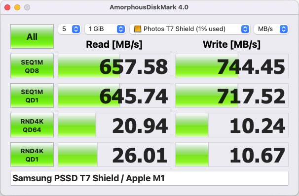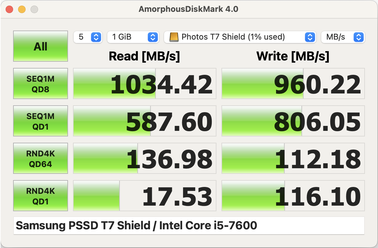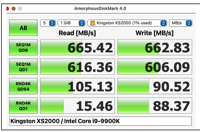 Were these drives encrypted? It makes a big difference in the sequential performance. For instance, here's a 2 TB Kingston XS2000 plugged into the TB3 port on my 2019 iMac, before encryption:Samsung T7 Shield 2 TB tests - This drive is 10 Gbps, and rated for 1050 MB/s read. APFS formatted.