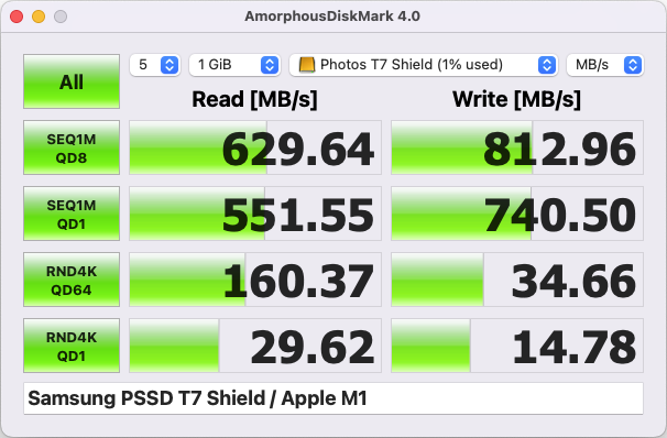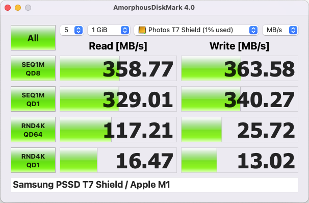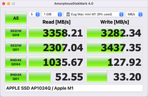Also, I believe there's something wrong with the measurement you made of the 1 TB internal SSD on your M1 Mini. 33.20 MB/s is much too slow for 4k random writes with queue depth = 1 (figure at lower R). Here are measurements made on my 2019iMac (Monterey 12.4). Without encryption, I got ~420 MB/s, and with encryption I got ~275 MB/s.