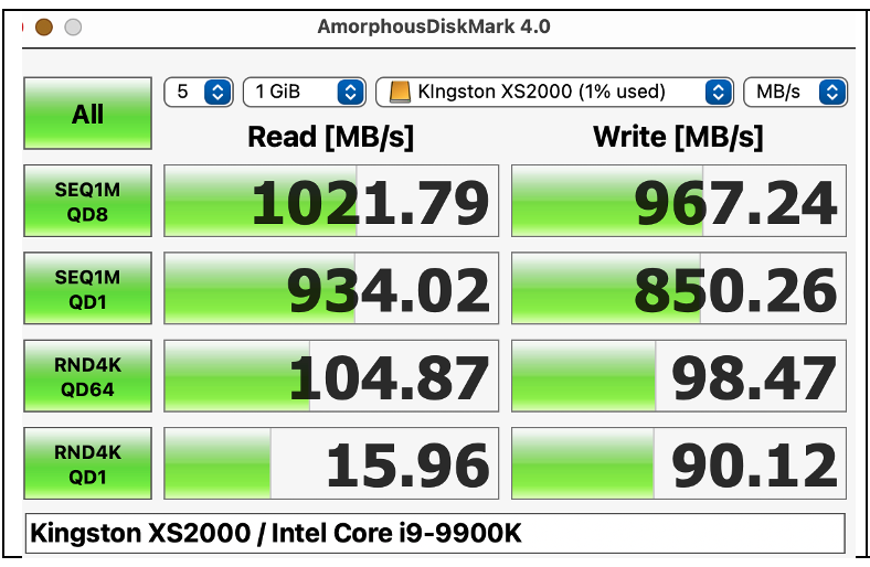 Unencrypted APFS. Default test settings.Were these drives encrypted? It makes a big difference in the sequential performance. For instance, here's a 2 TB Kingston XS2000 plugged into the TB3 port on my 2019 iMac, before encryption: