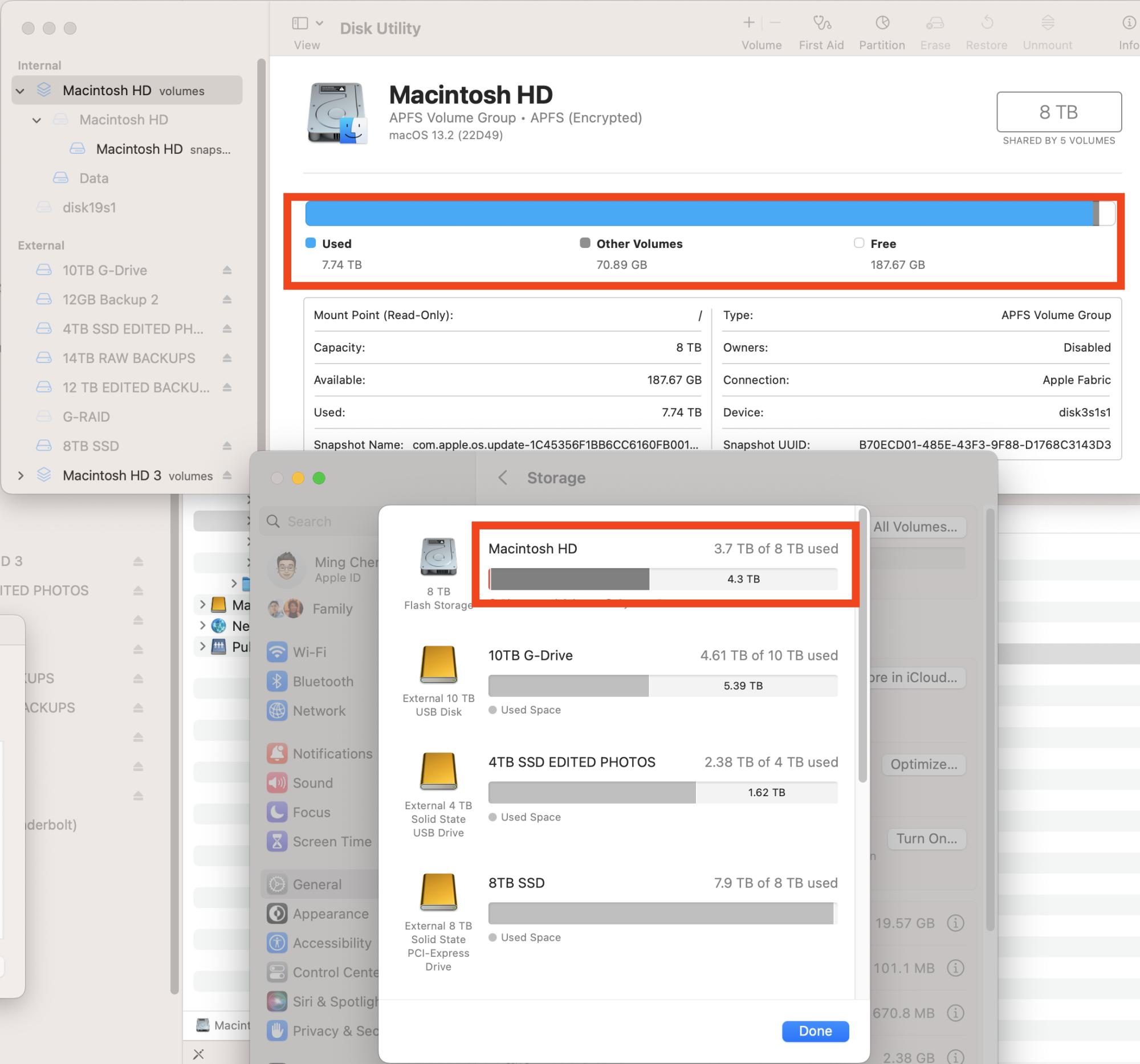 What is "disk19s1" in the DiskUtility picture? It appears to be another APFS sub-volume of the "Macintosh HD" group. What's the size of that and how did it get there? That could be the difference.