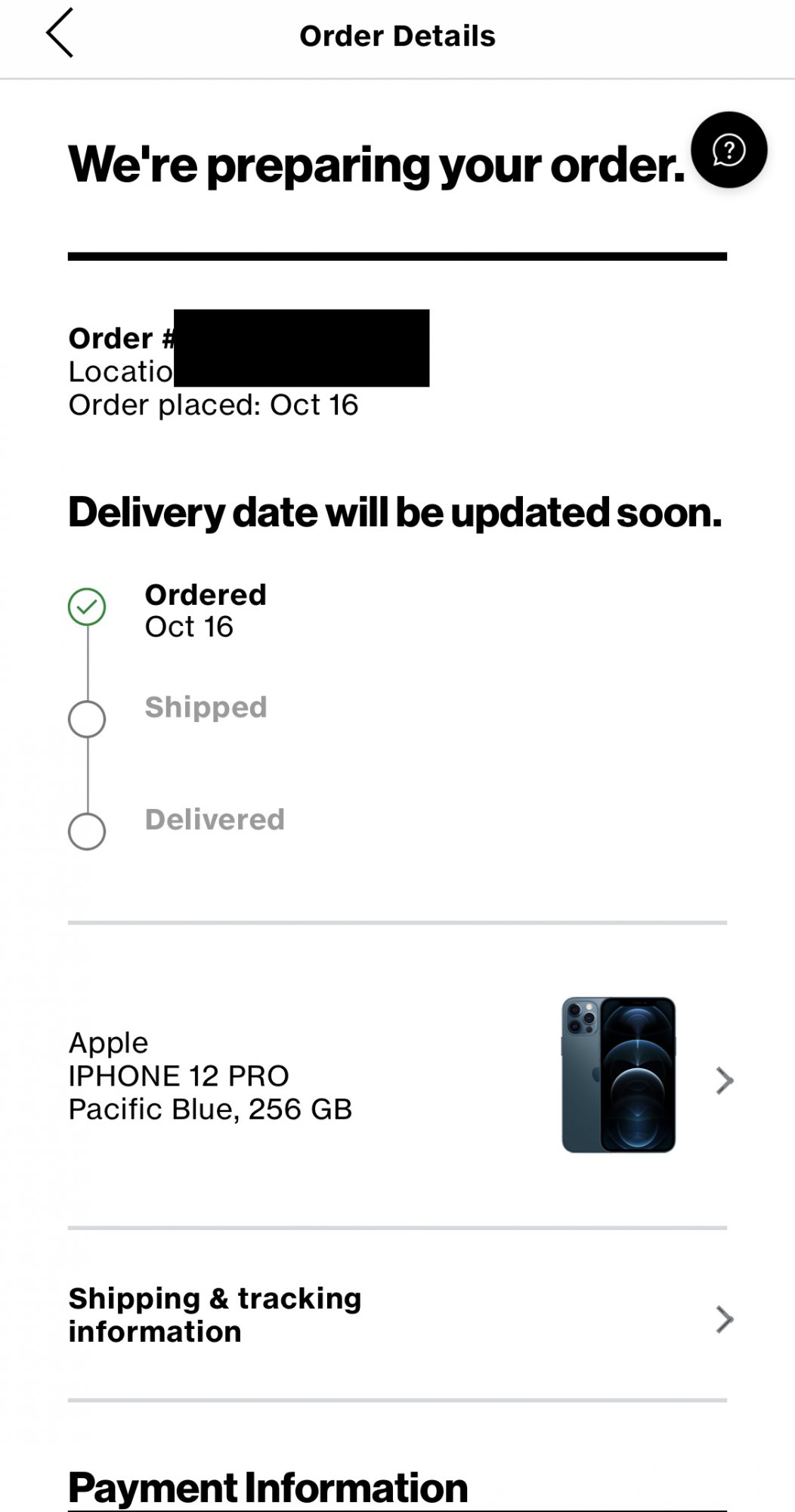 Ordered over the phone from Verizon business accounts on 10/16 @ 8:10am for delivery on 10/23 For an iPhone 12 pro pacific blue 128gb.