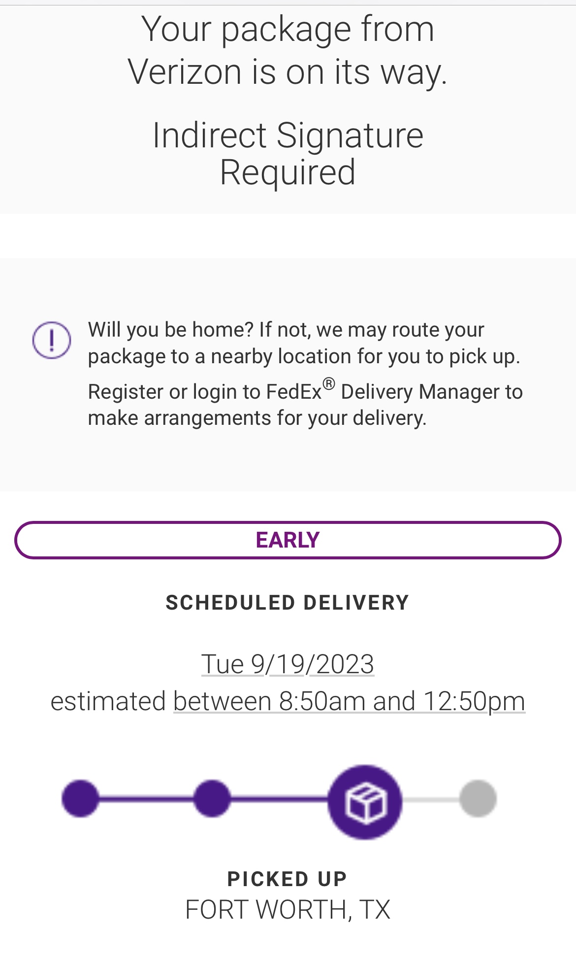 View attachment 2266265Ruh Roh. Verizon wants to deliver the new iPhone early? Tracking number matches the Verizon shipment email but this has to be the trade-in box?