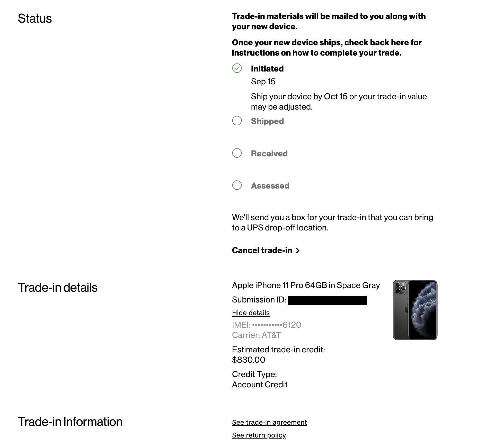Got my tracking number for FedEx on Sunday at around 6:30 PM US EST. Ordered my 15 PM on launch day for delivery on 9/22. One question though - when I ordered, I selected them to send me a trade in kit so I could send back my 12 PM via shipper. However, reading these comments, sounds like dropping my current phone off at a Verizon store would have been a better move (less chance for it to get lost and also gets processed quicker). Any chance Verizon will let me change it to drop off? I really don't want to touch anything at this point until I get the phone but once I do I may contact them and see if they can change my return of my existing phone for trade in from shipping to drop off. Any thoughts on that?