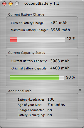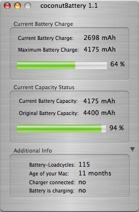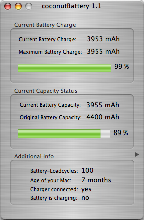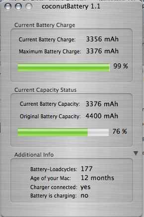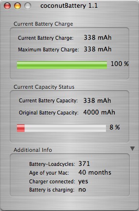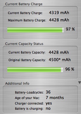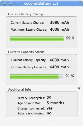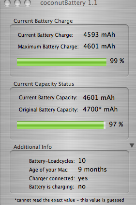 Also thought it would be kind of fun if everyone posted there batteries current capacity and how long they have had it and ill make a line graph or something to show how fast apple 'book batteries lose life. Course it wont be anything very precise but still kind of fun too see.