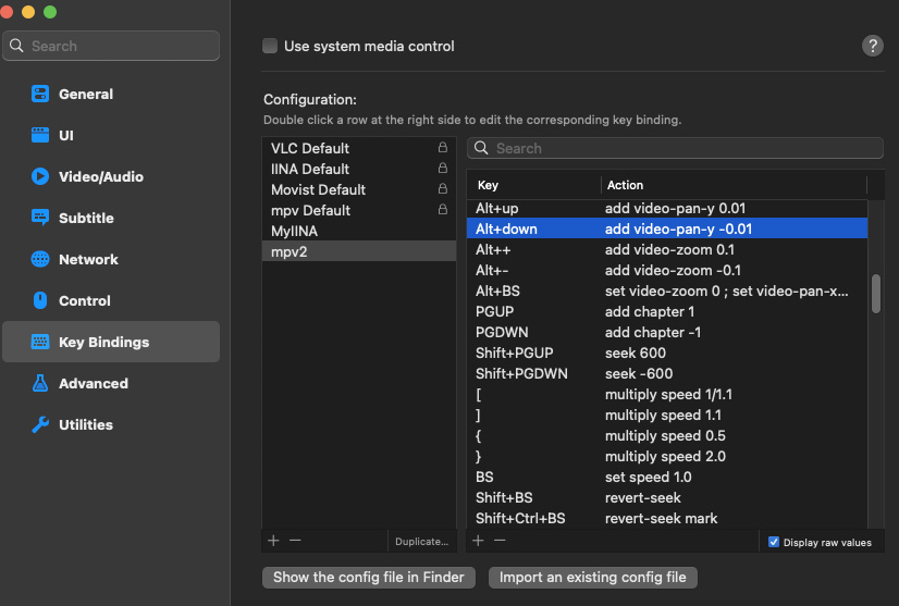 In IINA, you can duplicate the mpv Default configuration (Settings - Key Bindings) and edit to