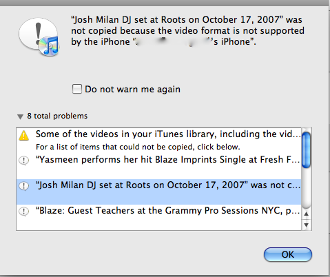 i've tried to sync a podcast with some videos in it but i received the following message..any idea why this error and what can i do to see the vidoes in my iphone ?