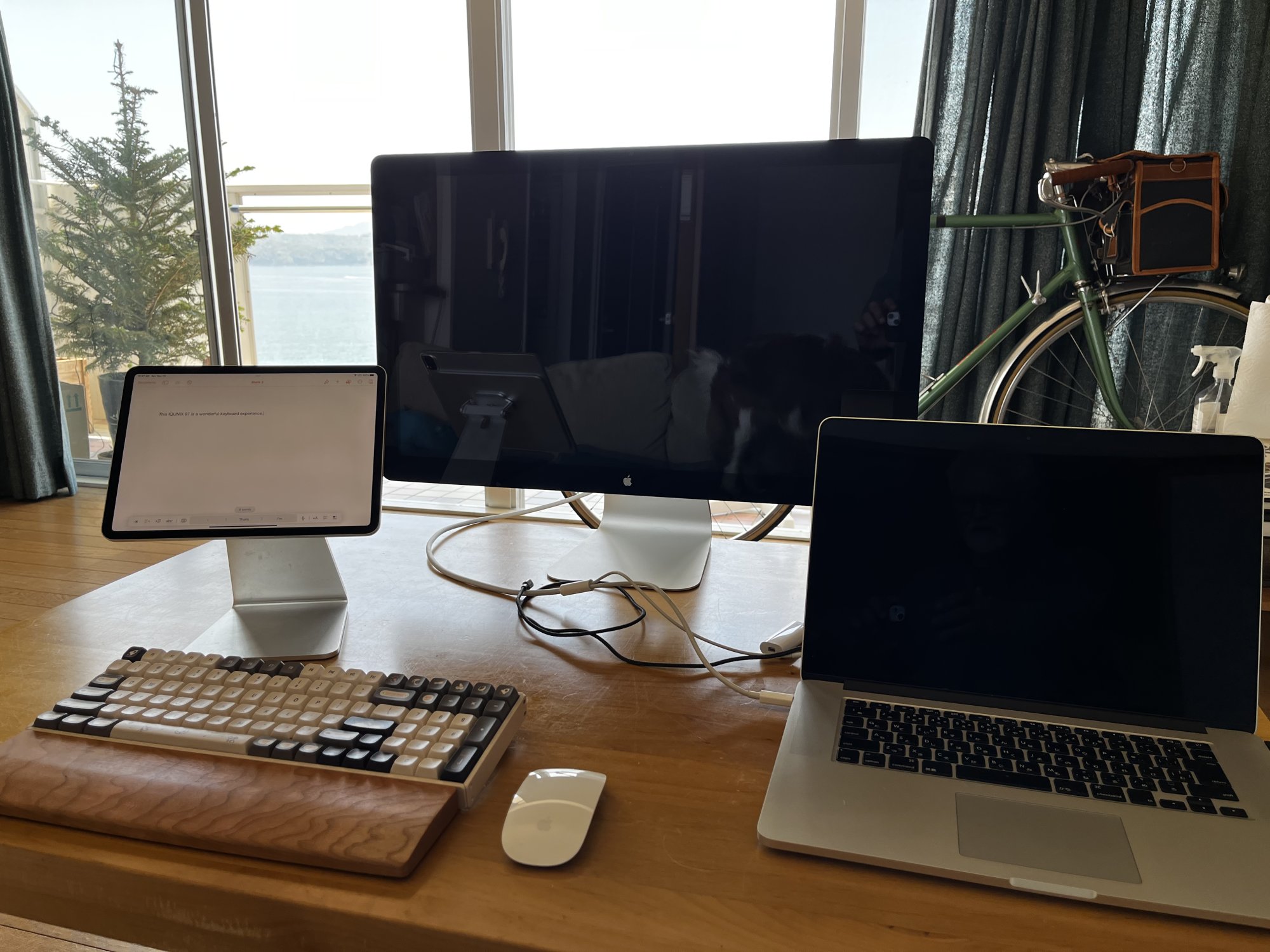 A mix of old and newer. MBP 2015 15” 16/1Tb, iPad Pro M1 512Gb, APPLE Thunderbolt Display 2015 (connected to iPad with APPLE TB2-TB3 adapter or to the MBP with dual change/data display connector), IQUNIX F97 ‘Hitchhiker’ mechanical keyboard, APPLE Magic Mouse 2. For portability and desktop use.