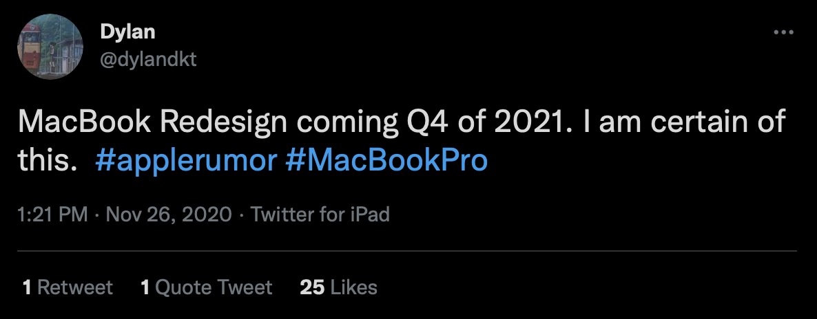 Just for point of reference dylandkt on Twitter, who has a pretty good (not perfect) track record, said last year these MacBook Pros with M1X were coming in the 4th quarter 2021 & followed up in the late spring with a more definite time frame which is bearing out.
