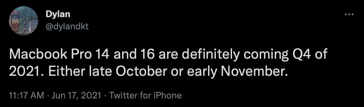 So, are you saying pre-order’s are not going to open up right away after the event?I was thinking that too — however — Since DylanDKT's track record seems spot on, it could be that this late October launch was the plan all along. I'm noticing on Apple's website, that the availability of the 16" is now November 2nd. This would fall in line with the expectation that there's still some time with the release candidates for Monterey & loading final build on the new MacBook Pros.