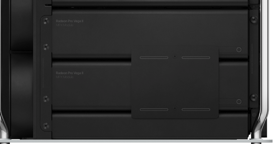 but it looks like a full size MPX module. ( the tongue with the two screw holes on the left match up with the top MPX Bays 2 module above. ) . The enclosing sheet metal of that probably won't be problematically hot, but it is still going to obstruct access to the power ports. Four full sized 3.5" that need to be somewhat vibrationally isolated is going to take some space. Plus going to want to let enough air get though so super dense vertical packing isn't a good idea.