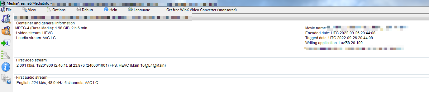 Kodierungseinstellungen : cabac=1 / ref=8 / deblock=1:-1:-1 / analyse=0x3:0x133 / me=umh / subme=9 / psy=1 / psy_rd=1.00:0.15 / mixed_ref=1 / me_range=16 / chroma_me=1 / trellis=2 / 8x8dct=1 / cqm=0 / deadzone=21,11 / fast_pskip=1 / chroma_qp_offset=-3 / threads=3 / lookahead_threads=1 / sliced_threads=0 / nr=0 / decimate=1 / interlaced=0 / bluray_compat=0 / constrained_intra=0 / bframes=3 / b_pyramid=2 / b_adapt=2 / b_bias=0 / direct=3 / weightb=1 / open_gop=0 / weightp=2 / keyint=250 / keyint_min=25 / scenecut=40 / intra_refresh=0 / rc_lookahead=60 / rc=crf / mbtree=1 / crf=20.0 / qcomp=0.60 / qpmin=0 / qpmax=69 / qpstep=4 / vbv_maxrate=62500 / vbv_bufsize=78125 / crf_max=0.0 / nal_hrd=none / filler=0 / ip_ratio=1.40 / aq=1:1.00