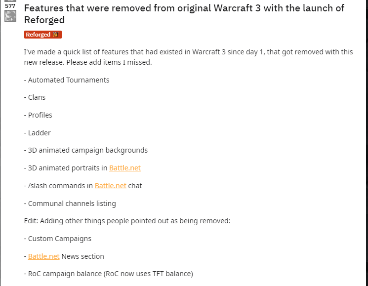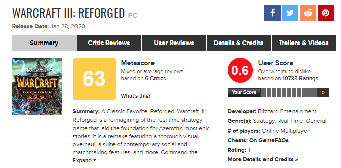 The uesr score is in free fall and is currently at 0.8. I'm not sure how Blizzard can save face and/or turn this around. I guess this rollout broke the original warcraft III game and most (all?) of the short comings in Reforged has been foisted on to the original game.