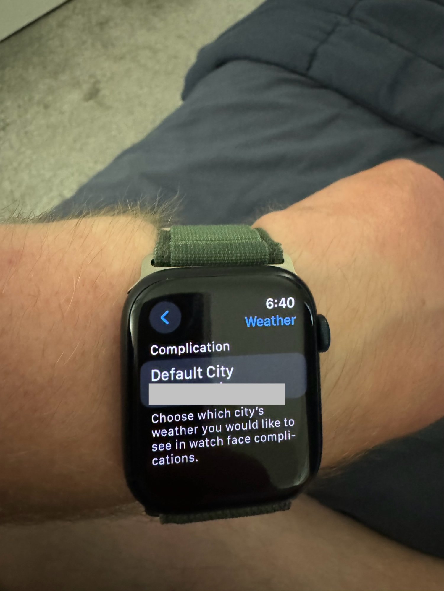 After updating to watchOS 10, my weather temperature compilation on my watch face will not update. It shows just the two dashes “- -“. I’ve tried everything and checked everything. I made sure weather location was set to always and precise location etc. I did notice in the weather settings on the watch that I don’t have a current city listed, just default city (see pic below). Any tips for fixing this? Thanks!