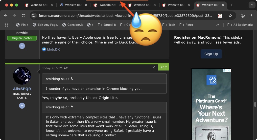 I often see this on websites: “This website is best viewed in the following browsers: Chrome Firefox Edge”. Chrome is always listed first, Firefox second. Once in a while Edge. But NEVER Safari. Why? And why does every website cream their pants over Chrome? I don’t trust Chrome. It’s Google, the company that sells all your data. Why is Safari never listed? Why the prejudice against Safari?