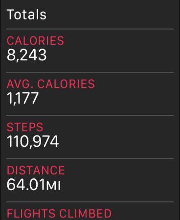Down to a more typical week. I’m beginning running again this week though, so I’ll be interested to see how much that impacts my totals.