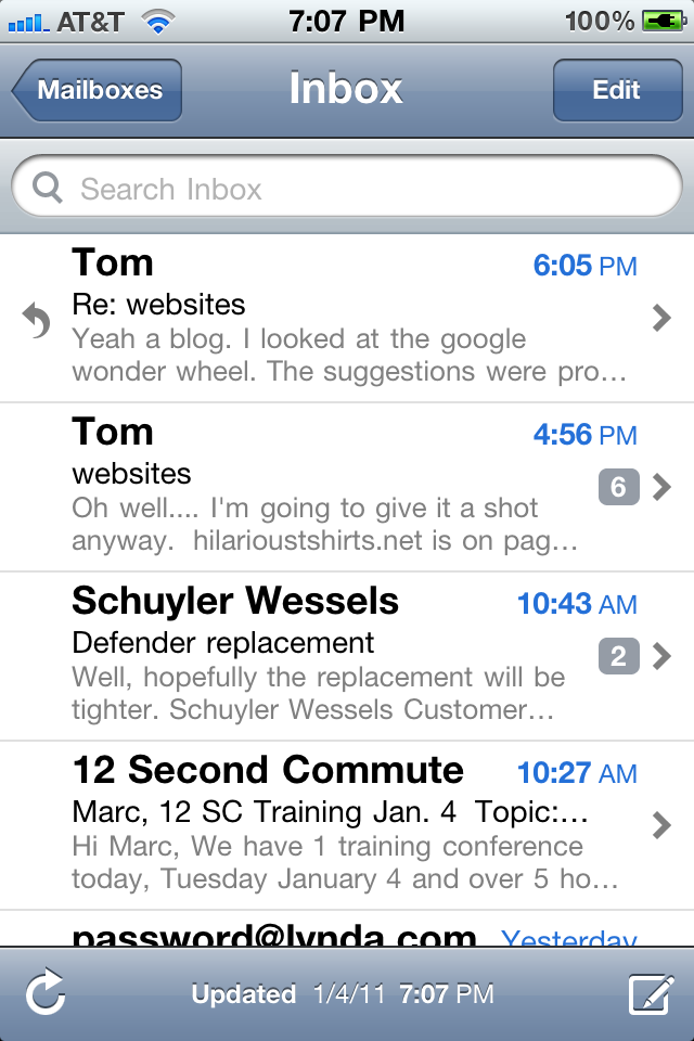 M mpossoff macrumors 68020 Original poster Mar 21, 2010 2,093 2 Philadelphia Jan 4, 2011 #1 Hi attached is an issue I'm having with my email app. I'm using MS exchange. As you see the first email is separate from the next email. It should be included with the 6. What's going on? Attachments photo.PNG 149.3 KB · Views: 94