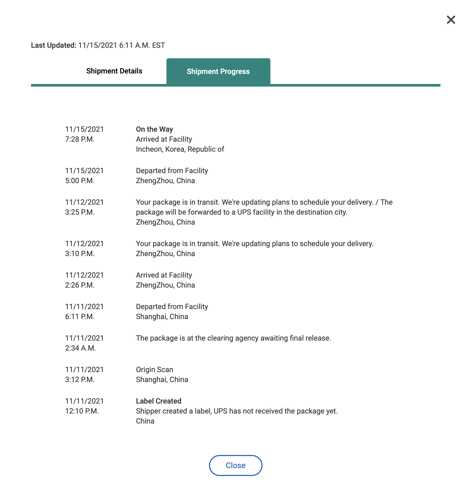 Congrats, mine still shows stuck in Shanghai this morning. Calling UPS just gets me “we expect delivery on the 15th” when I ask what they are basing that on they can’t tell me. I have 100 pounds of electrical gear that shipped UPS ground that has moved from Oregon to Texas in less time than my MacBook has been sitting in Shanghai!So, my order is finally in Incheon, South Korea. The Zhengzhou purgatory only lasted the weekend. UPS has updated the delivery from Nov 15 (today) to Nov 16.
