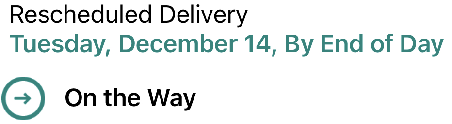 Tuesday, December 14th -- a full week before Apple's estimated delivery date once shipped, 2 days before the earliest possibility in the order's original delivery window, and 3 days before FedEx's own delivery estimate -- it gets on a plane from Memphis to Chicago, goes from the big O'Hare distribution center to my local facility, gets on a truck, and is delivered by noon! They even placed it in between our front door and screen door to keep it safe. I also believe I could have modified the "No signature needed" field in the FedEx app, but I chose not to and had no issues.