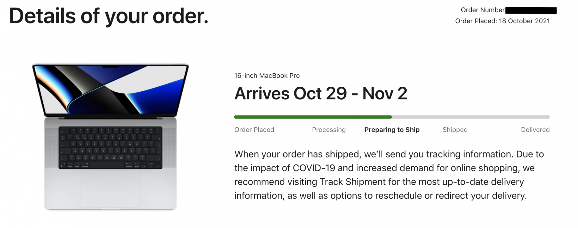 Don't put too much stock in the "status" on the apple page. Mine still says "Preparing to ship" on the apple site, but I already got the tracking through UPS (shared above) and know my machine is now sitting one state over in Louisville, KY.Mine still says October 26th to Nov 3rd and it hasn’t even been charged or prepared for shipping 🙈