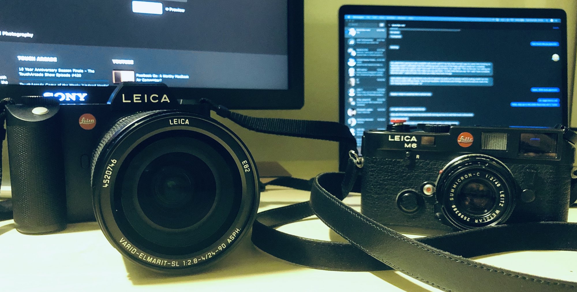 I have my obligatory Leica kit, although I rarely use it. I get tired of the tedious film loading and tiny finder of the IIIc, so usually use my lenses on a Canon 7.